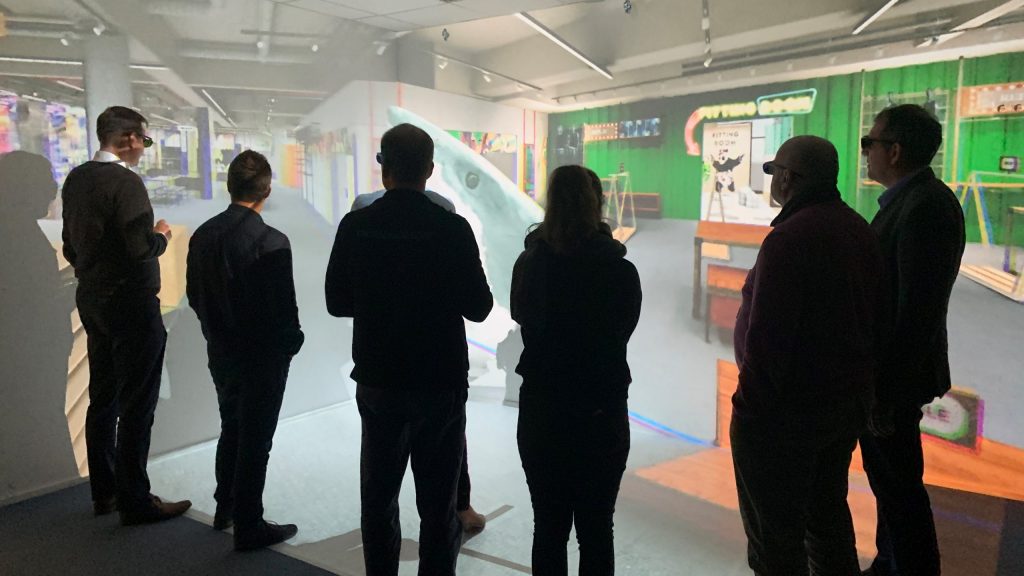 Konventionelle VR isoliert. SmartCave verbindet. In einem begehbaren Raum erleben mehrere Personen gemeinsam virtuelle Welten. Vor Ort oder mit remote zugeschalteten Teilnehmern. Ohne einengende VR-Brillen, mit vollem Blick auf Kollegen und Umgebung.