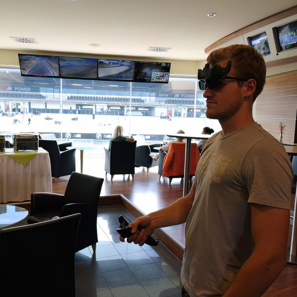 Wir sponsern nicht nur, wir sind ebenfalls vor Ort. Direkt über dem Fahrerlager ist die Loge von PROsport, wo wir heute eine kleine Installation unserer SmartCave aufgebaut haben. Auf den Bildern testen wir unsere Installation noch. Da passen wir uns an den Rennbetrieb an. Auch wenn wir es ein wenig gemütlicher und das Catering direkt in der Nähe haben.